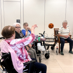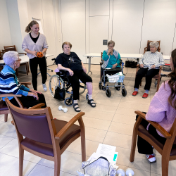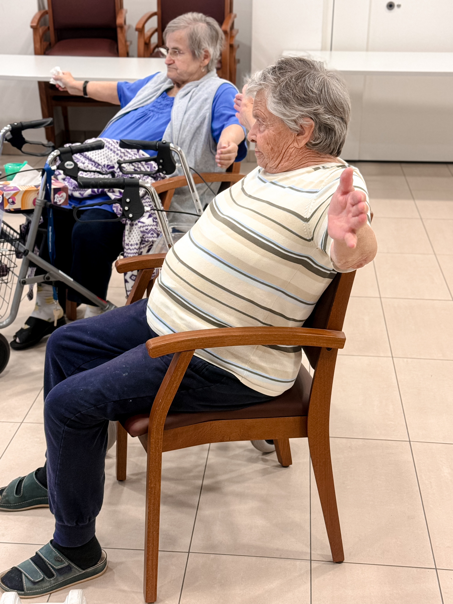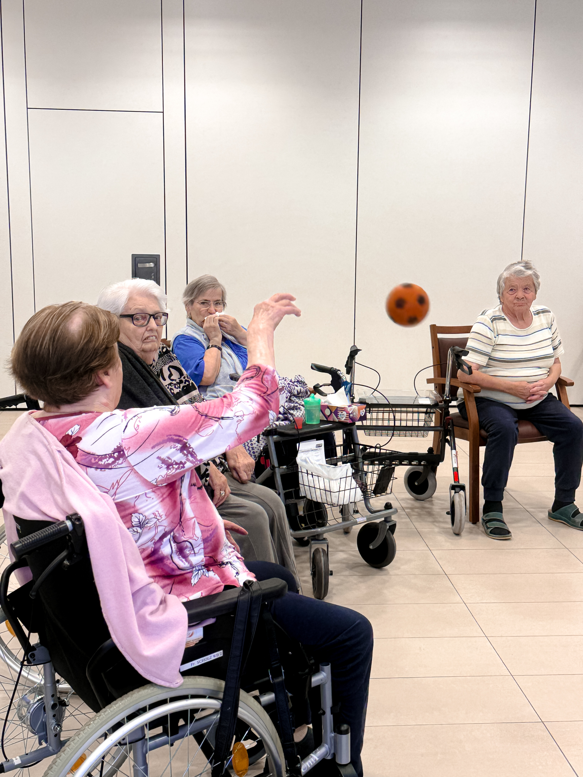 Es wurden gezielte Übungen für Hände und Füße durchgeführt – angepasst an die körperlichen Möglichkeiten jedes Einzelnen. Manche Bewohner:innen sind fitter, andere haben körperliche Einschränkungen – doch alle machten mit, so wie es für sie angenehm und machbar war. Besonders beliebt waren die Ballspiele, die nicht nur die Motorik förderten, sondern auch für viel Freude und gemeinsames Lachen sorgten.