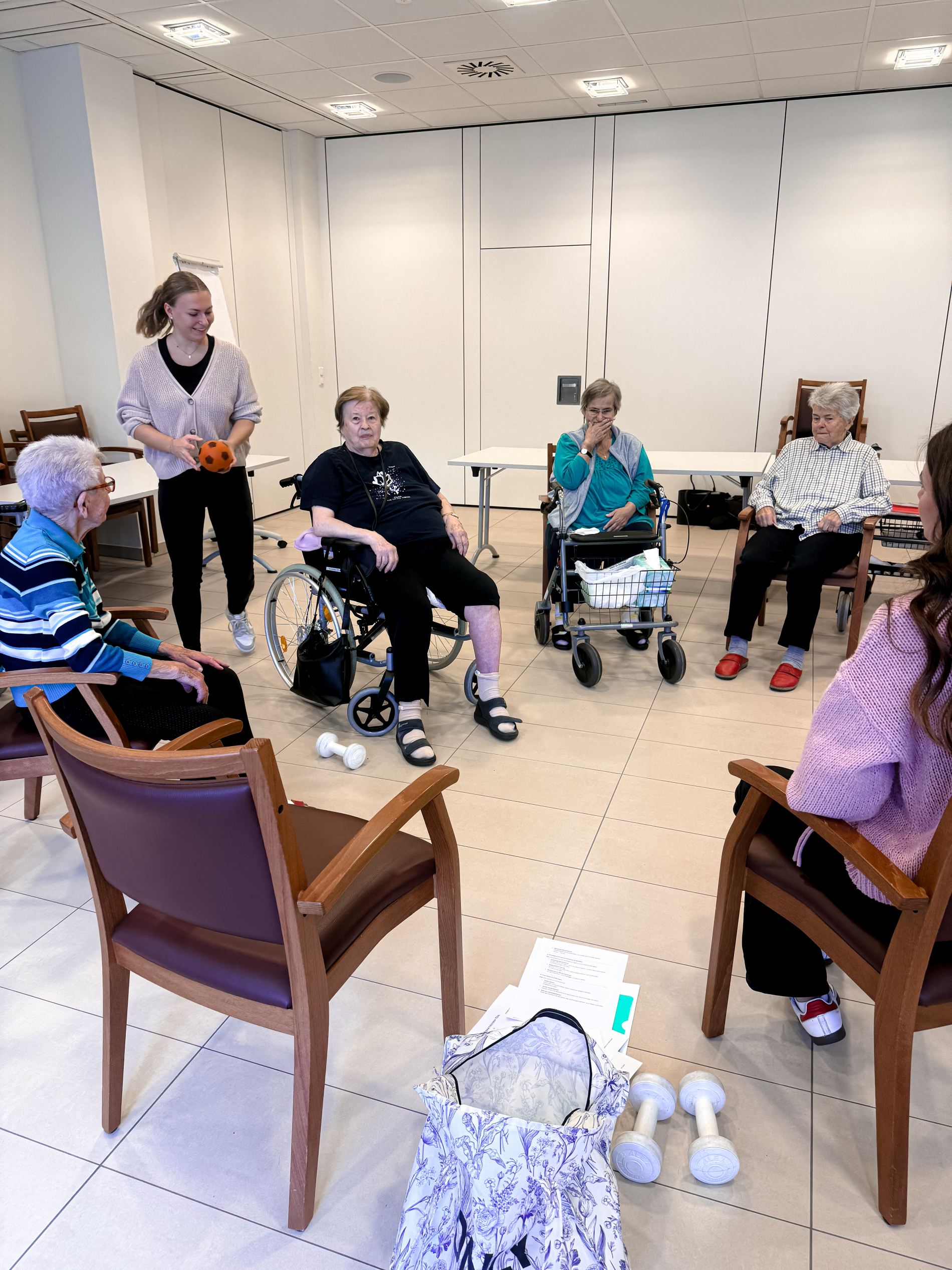 Im Fokus stand die Frage, wie körperliche Aktivität und gezieltes Training zur Erhaltung der Muskelkraft beitragen können. Besonders im Alter ist es entscheidend, beweglich zu bleiben und die Muskulatur zu stärken, um Selbstständigkeit, Lebensqualität und Wohlbefinden zu fördern. Die Schülerinnen vermittelten nicht nur theoretisches Wissen, sondern setzten auch praktische Übungen um, die auf die individuellen Bedürfnisse unserer Bewohner abgestimmt waren.